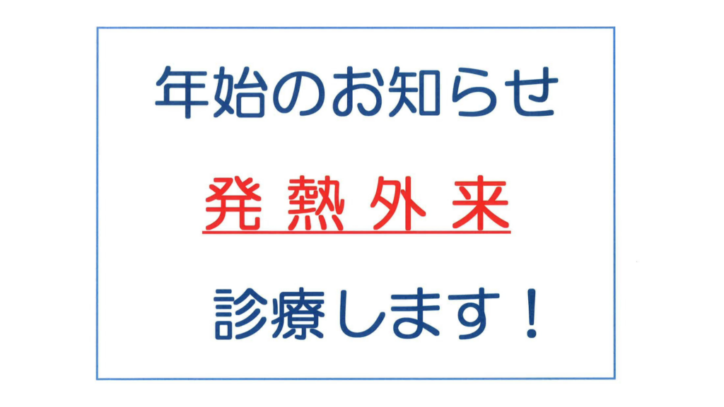 年始 診察のお知らせお知らせ 年始の診察は、1月2日(金)・1月3日(水)を【発熱外来】として診療いたします。予約なしでも診察可能ですが、出来るだけお電話していただけると助かります。基本的には、問診、診察、検査、処方となります。9:00~13:00 (受付時間:12:30まで)となります。受診の際は必ずマスクを着用してお越しください。