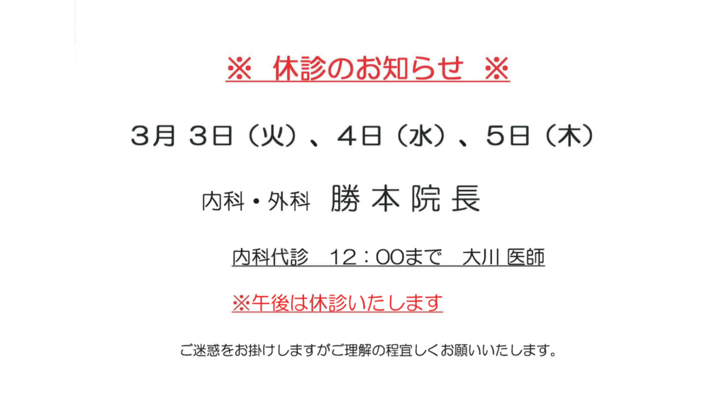 なお、内科は 大川医師が12:00まで代診 いたします。